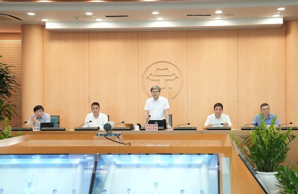 Phó Chủ tịch UBND thành phố Trương Việt Dũng chủ trì cuộc họp, được kết nối trực tuyến tới 126 xã, phường trên địa bàn. Ảnh: Quốc Lũy - TTXVN