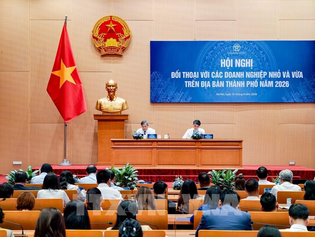 Chủ tịch UBND TP Hà Nội Vũ Đại Thắng trả lời báo chí truyền thông tại Hội nghị đối thoại với doanh nghiệp nhỏ và vừa ngày 16/4/2026. Ảnh: Trung Nguyên - TTXVN