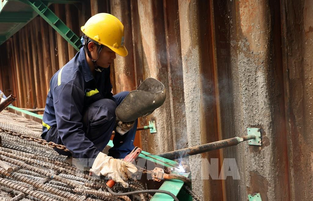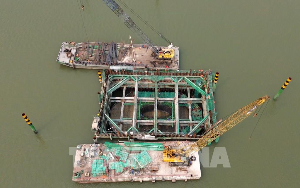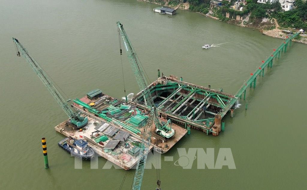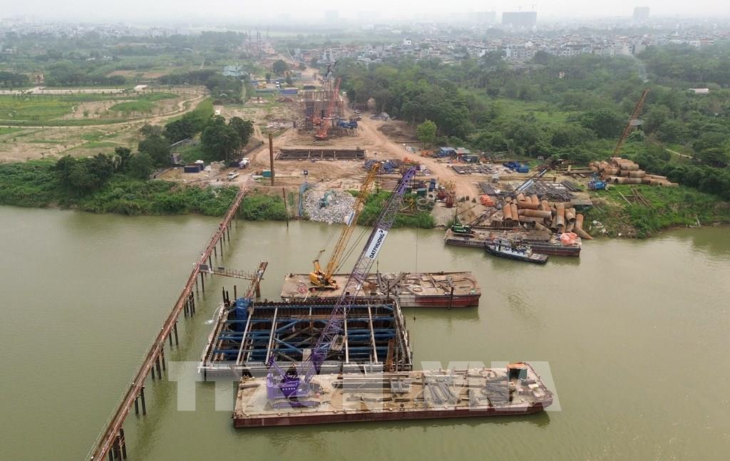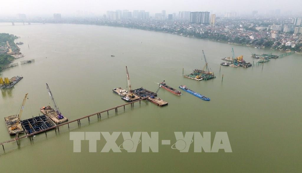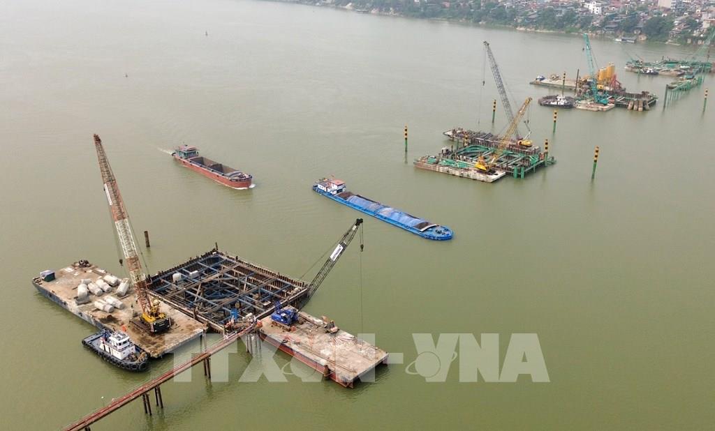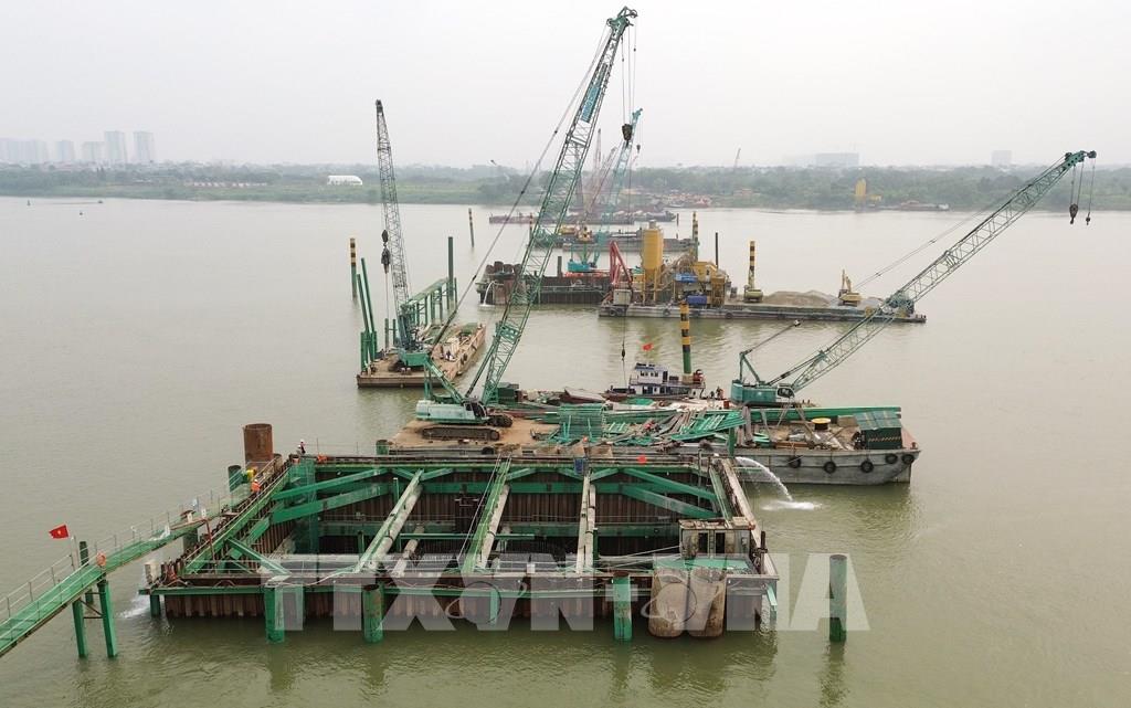 Nhà thầu triển khai thi công hạng mục trụ cầu giữa sông Hồng. Ảnh: Quốc Khánh - TTXVN
