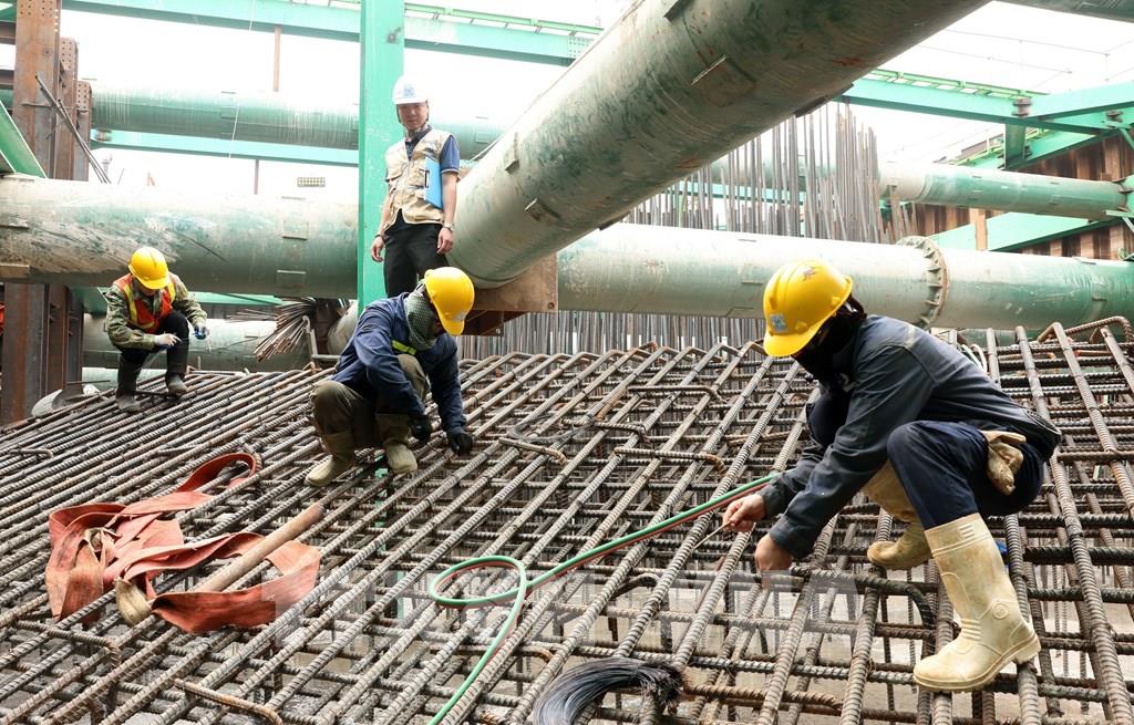 Tranh thủ thời tiết thuận lợi đầu năm, các nhà thầu thi công cầu Trần Hưng Đạo vượt sông Hồng đang huy động tối đa nhân lực, máy móc, tổ chức nhiều mũi thi công song song, quyết tâm bám “đường găng” tiến độ để đưa công trình về đích đúng cam kết. Ảnh: Quốc Khánh - TTXVN