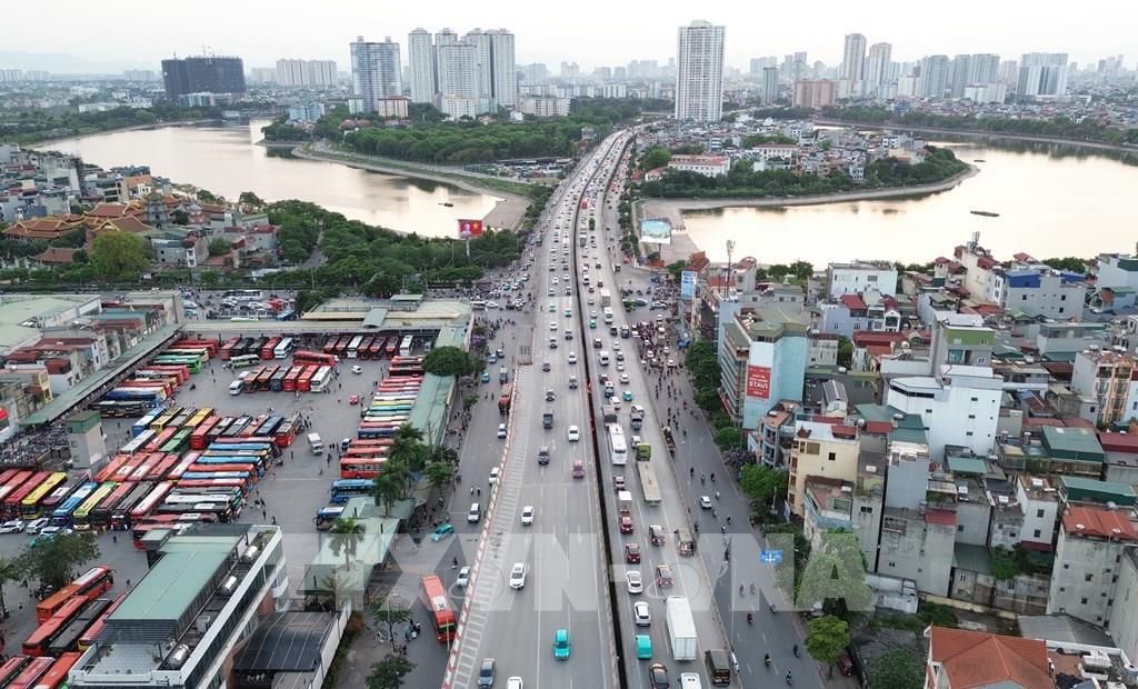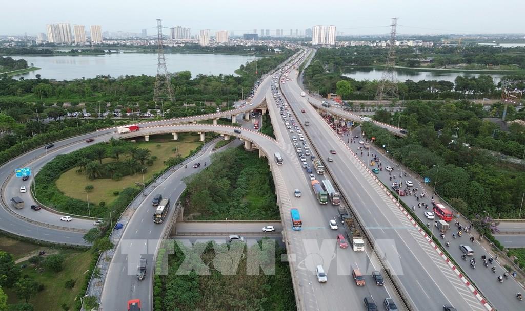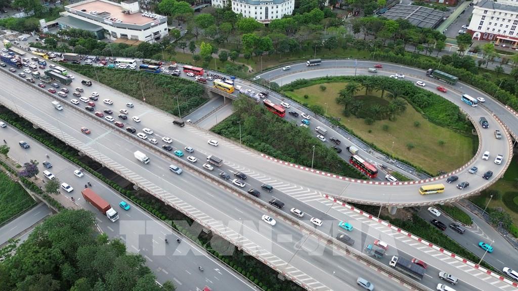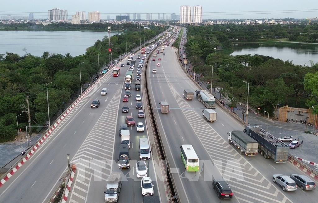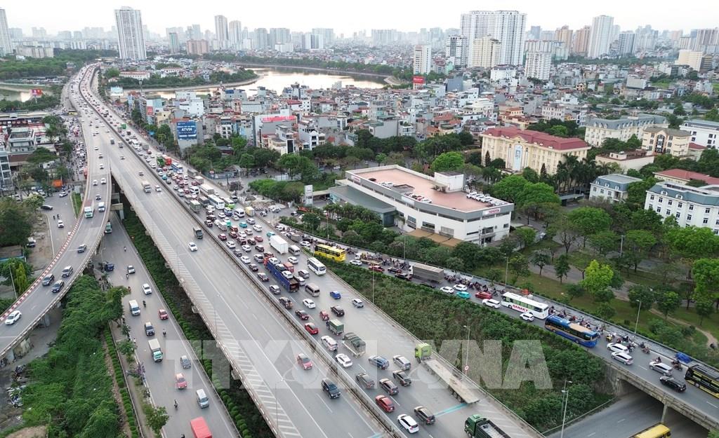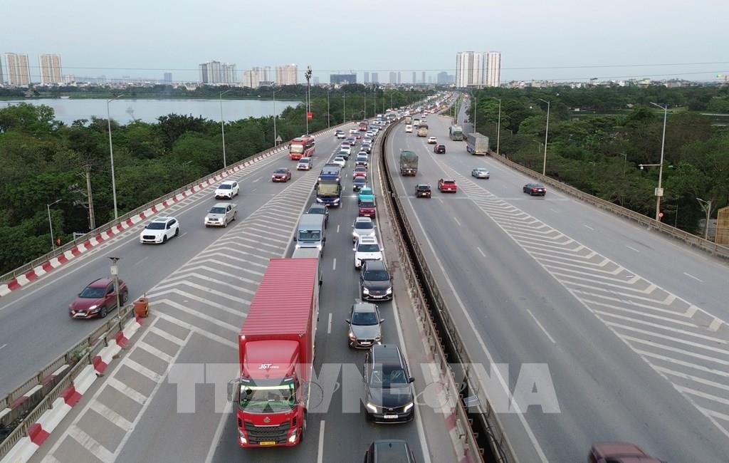 Các phương tiện di chuyển khó khăn trên đường vành đai 3 trên cao hướng vao trung tâm thành phố trong cuối buổi chiều 29/4. Ảnh: Quốc Khánh - TTXVN