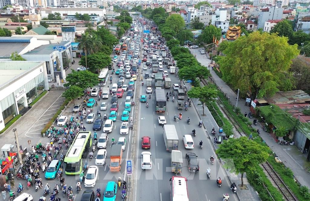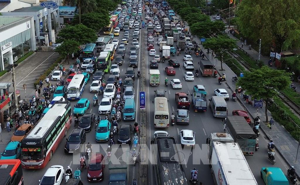 Đường Giải Phóng các phương tiện di chuyển khó khăn. Ảnh: Quốc Khánh - TTXVN