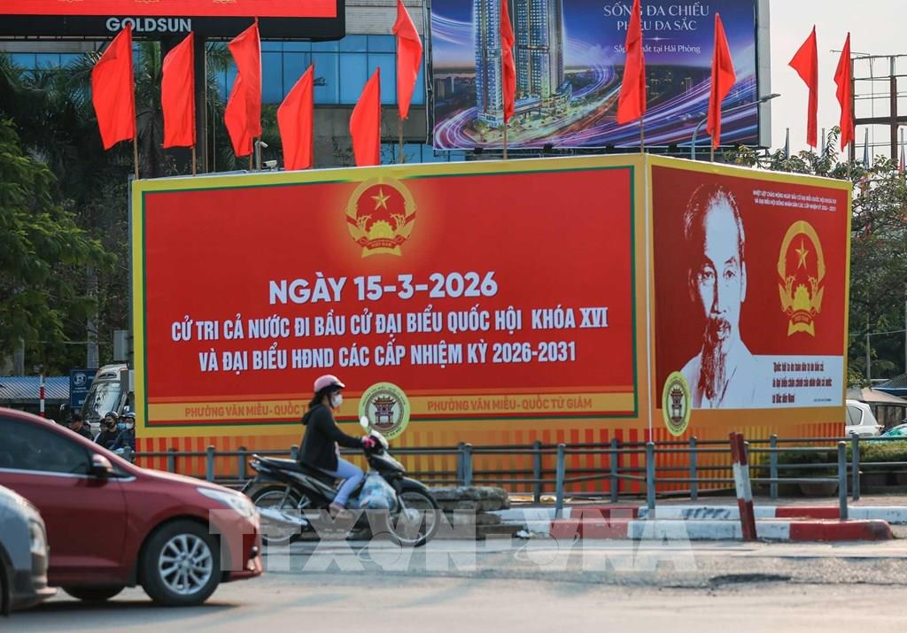 Không khí rực rỡ sắc đỏ lan tỏa trên khắp phố phường, tạo nên bầu không khí phấn khởi ngày bầu cử. Ảnh: Hoàng Hiếu - TTXVN