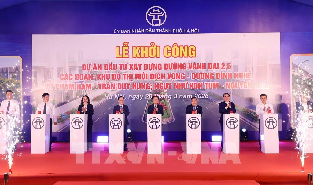 Ngày 20/3, chào mừng thành công cuộc bầu cử Quốc hội khóa XVI và HĐND các cấp nhiệm kỳ 2026-2031, UBND thành phố Hà Nội tổ chức Lễ khởi công Dự án đầu tư xây dựng đường Vành đai 2,5 các đoạn: Khu đô thị mới Dịch Vọng - Dương Đình Nghệ; Vũ Phạm Hàm - Trần Duy Hưng; Ngụy Như Kon Tum - Nguyễn Trãi. Tham dự buổi lễ có Ủy viên Trung ương Đảng, Phó Bí thư Thành ủy, Chủ tịch UBND thành phố Hà Nội Vũ Đại Thắng; Ủy viên Trung ương Đảng, Phó Bí thư Thành ủy Hà Nội Nguyễn Trọng Đông, cùng đại diện lãnh đạo các sở, ngành, chính quyền địa phương và nhà thầu thi công dự án.