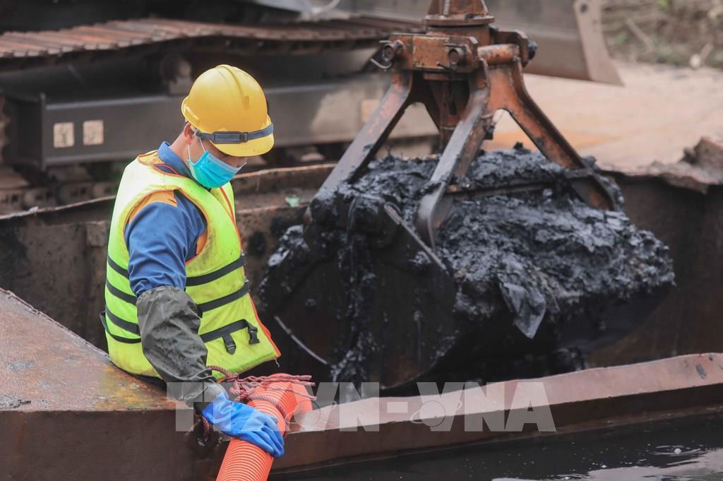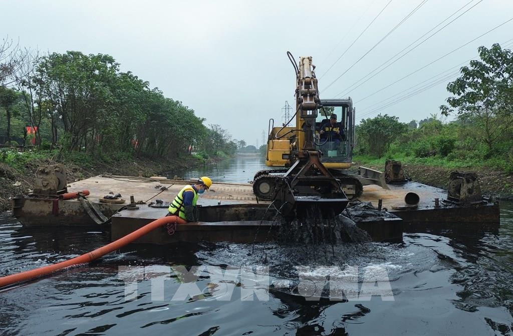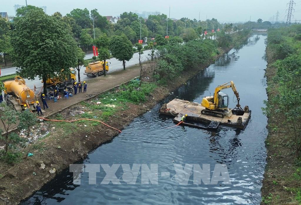 Đầu tháng 3, công nhân Công ty Thoát nước Hà Nội khẩn trương thực hiện công tác nạo vét sông, hồ đang ô nhiễm, nâng cao năng lực tiêu thoát trước mùa mưa 2026. Ảnh: Phan Phương – TTXVN