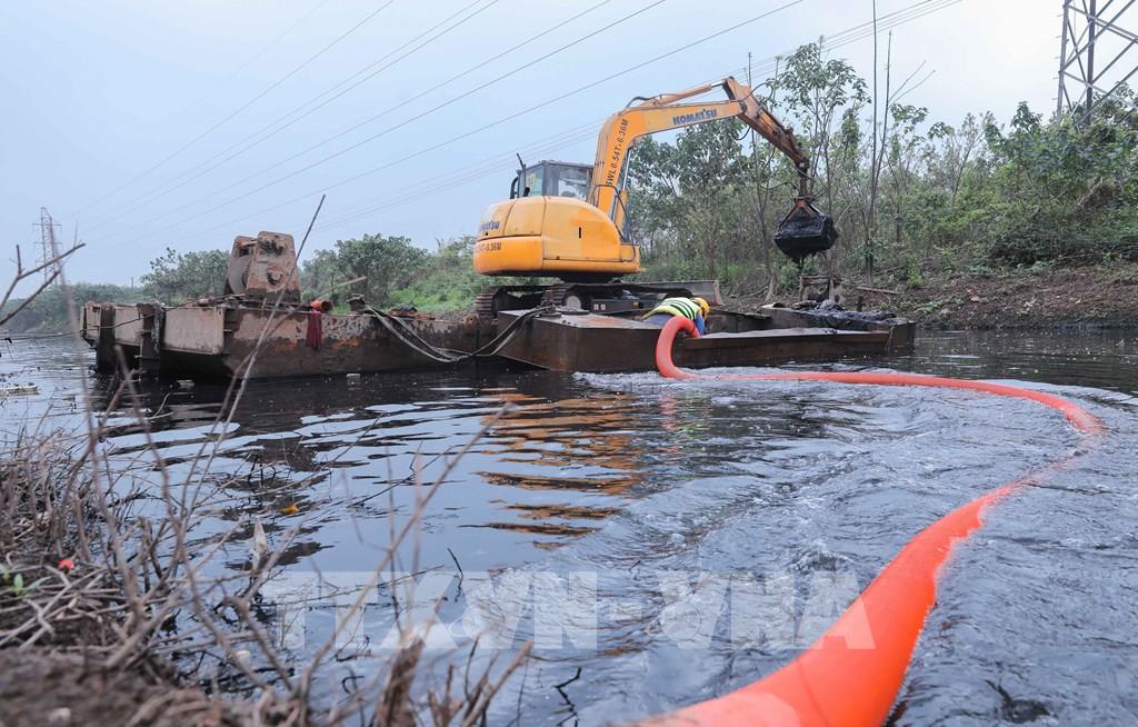 Sử dụng dây chuyền Ponton, công việc hút bùn được tổ chức theo ca (3 tiếng một ca) để đảm bảo sức khỏe và tiến độ thi công. Ảnh: Phan Phương – TTXVN