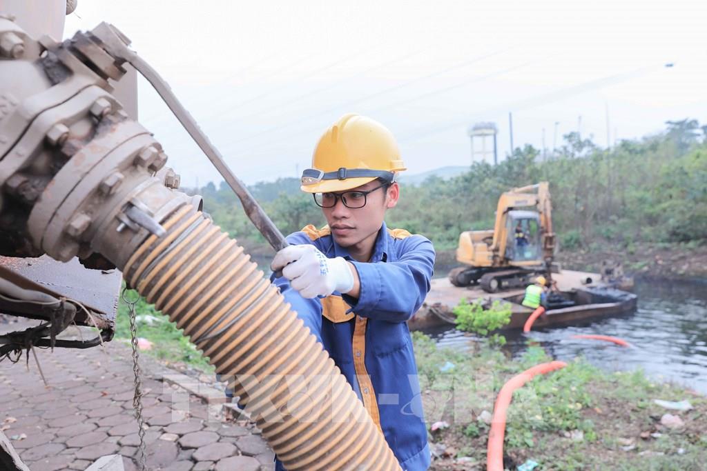 Bùn được các công nhân hút qua hệ thống dây chuyền ponton, vận chuyển lên xe chuyên dụng theo quy trình khép kín. Ảnh: Phan Phương – TTXVN