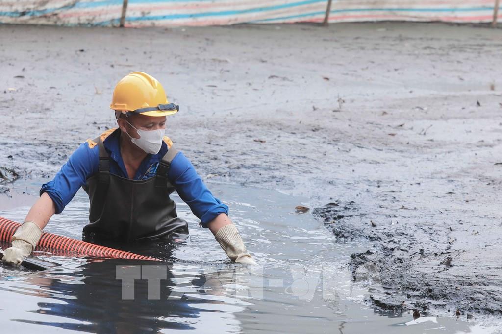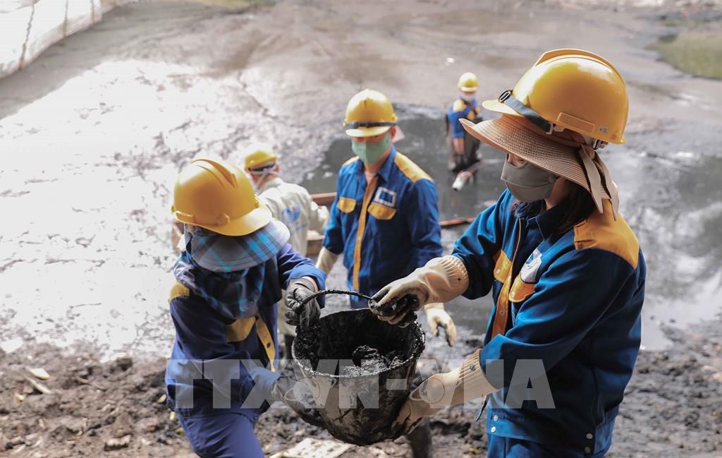 Công nhân ngâm mình trong lớp bùn đen dày trung bình 1,2m, có đoạn sâu gần 2m suốt nhiều giờ để hút bùn trực tiếp dưới hồ Tân Mai. Ảnh: Phan Phương – TTXVN