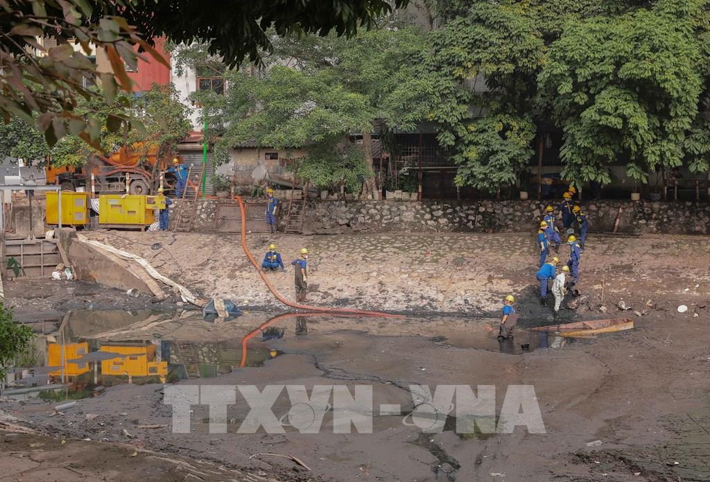 Công nhân thay phiên ngâm mình trong lớp bùn đen dày trung bình 1,2m, có đoạn sâu gần 2m suốt nhiều giờ để hút bùn trực tiếp dưới hồ Tân Mai. Ảnh: Phan Phương – TTXVN