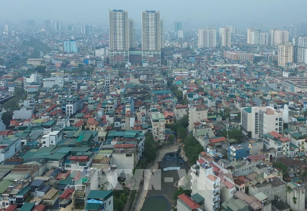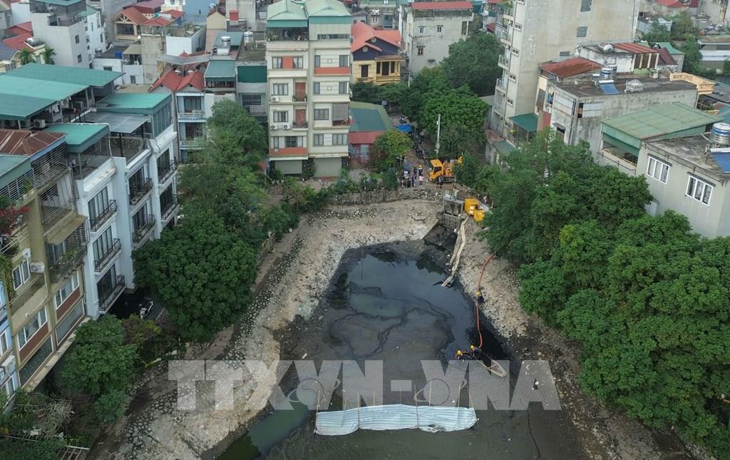 Hồ Tân Mai đang được xử lý giúp tăng khả năng tiêu thoát nước khu vực Nguyễn Chính – Tân Mai (phường Hoàng Mai), chủ động chống ngập trước mùa mưa. Ảnh: Phan Phương – TTXVN