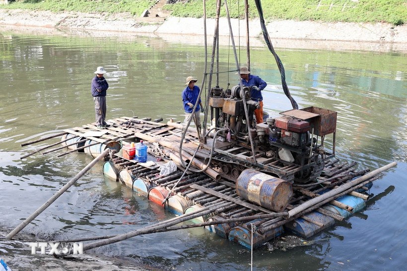 Công nhân khoan thăm dò để chỉnh trang, cải tạo hai bên bờ sông Tô Lịch. Ảnh: Vũ Quang/TTXVN