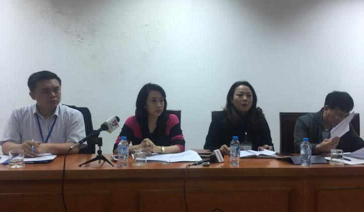 Bà Nguyễn Thị Thanh Hằng, Chánh văn phòng UBND quận Long Biên (thứ hai từ trái sang) tại cuộc họp báo. Ảnh: Mạnh Khánh/TTXVN.