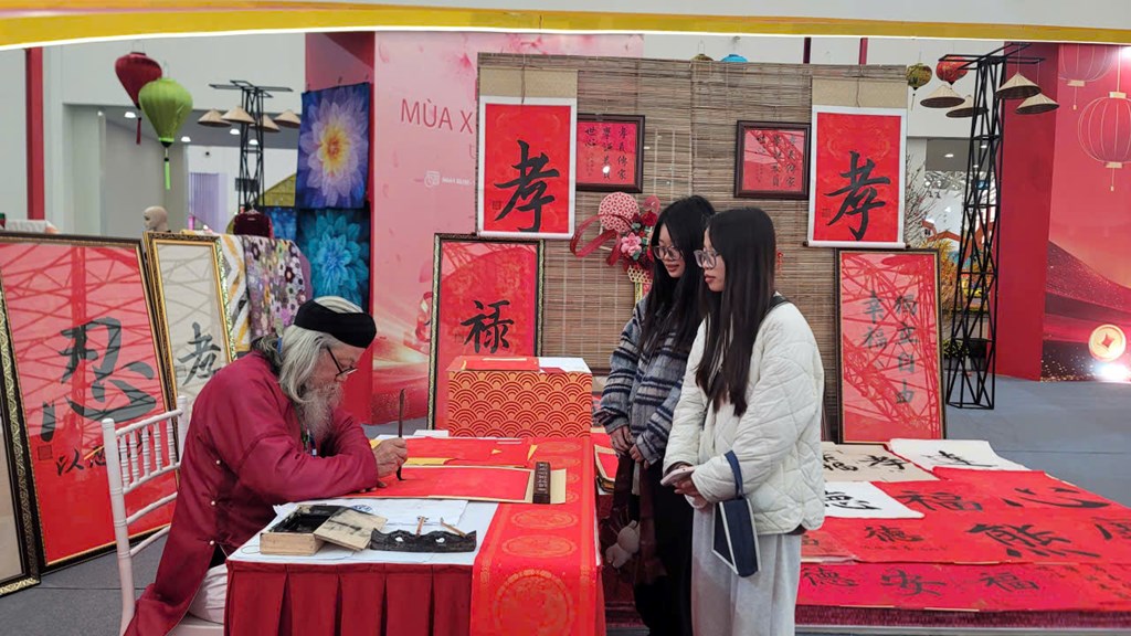 Các bạn trẻ xin chữ tại Hội chợ