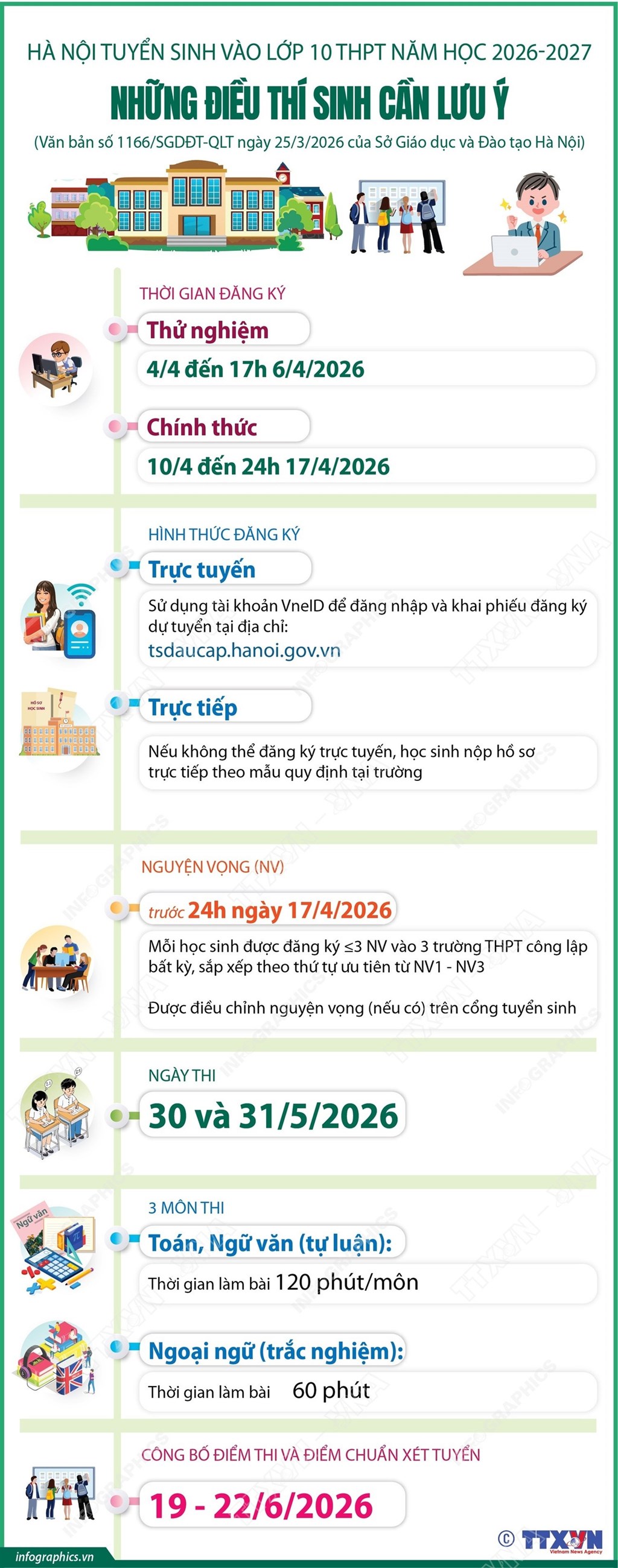 Theo văn bản số 1166/SGDĐT-QLT ngày 25/3/2026 của Sở Giáo dục và Đào tạo Hà Nội về việc hướng dẫn tuyển sinh vào lớp 10 trung học phổ thông năm học 2026-2027, mỗi học sinh được đăng ký tối đa 3 nguyện vọng vào các trường công lập không chuyên bất kỳ; học sinh sử dụng tài khoản định danh điện tử VneID để đăng nhập và khai phiếu đăng ký dự tuyển tại Cổng tuyển sinh đầu cấp của thành phố, địa chỉ: tsdaucap.hanoi.gov.vn.