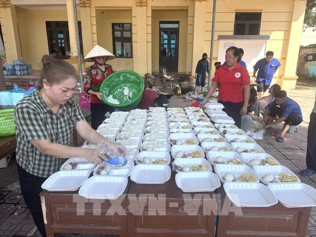 Hiện, các hộ dân trên địa bàn thôn An Lạc, Phú Nỷ, Hòa Bình đang được di dời đến điểm tập kết tại trường mầm non Trung Giã (thôn Phong Mỹ, xã Trung Giã, thành phố Hà Nội) với sức chứa khoảng 500 người. Từ 8/10 đến nay, các hộ dân di dời đều được UBND xã chăm lo, đảm bảo cuộc sống hàng ngày. Hiện có hơn 100 người dân đang lưu trú tại điểm tập kết này. UBND xã dự kiến mở thêm điểm di dời tại trụ sở Đảng ủy xã Trung Giã nếu tình hình diễn biến phức tạp. Bà Lê Thị Xuyến, 80 tuổi, thôn An Lạc, xã Trung Giã chia sẻ: “Năm ngoái tôi phải di dời lên trên này mất 4 ngày. Năm nay, nước to hơn năm ngoái, chúng tôi di dời lên đây từ 10 giờ hôm qua. Ông nhà tôi và các cháu phải ở lại giữ nhà không ngập hết. Nước to quá không chạy được gì cả. Chuyển lên đây, chỗ ăn ở sạch sẽ, tôi rất hài lòng.“Từ hôm qua chúng tôi phục vụ bà con vùng lũ hơn 400 suất ăn cho bà con phải di dời đến đây, hôm nay chúng tôi chuẩn bị hơn 500 suất ăn cho bà con di dời. Người dân chúng tôi chung tay góp sức cùng nhau vượt qua khó khăn khi ngập lụt. Trên tinh thần tự nguyện, thấy nước lũ lên mọi người tự bảo nhau chuẩn bị các phần ăn ủng hộ bà con bị ngập lụt.”, Chị Nguyễn Thị Hương (sinh năm 1986, trú tại phố Nỷ, xã Trung Giã) cho biết.