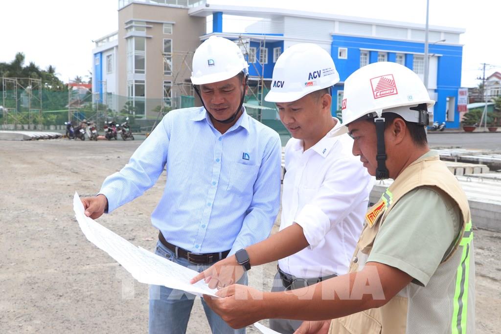 Đội ngũ kỹ sư giám sát thi công trên công trường Dự án nâng cấp, mở rộng Cảng hàng không Cà Mau. Ảnh: Tuấn Phi - TTXVN