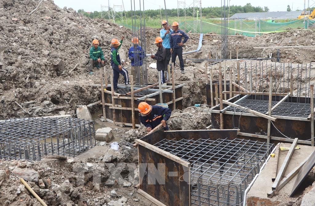 Công nhân thi công hạng mục móng của nhà ga Dự án nâng cấp, mở rộng Cảng hàng không Cà Mau. Ảnh: Tuấn Phi - TTXVN