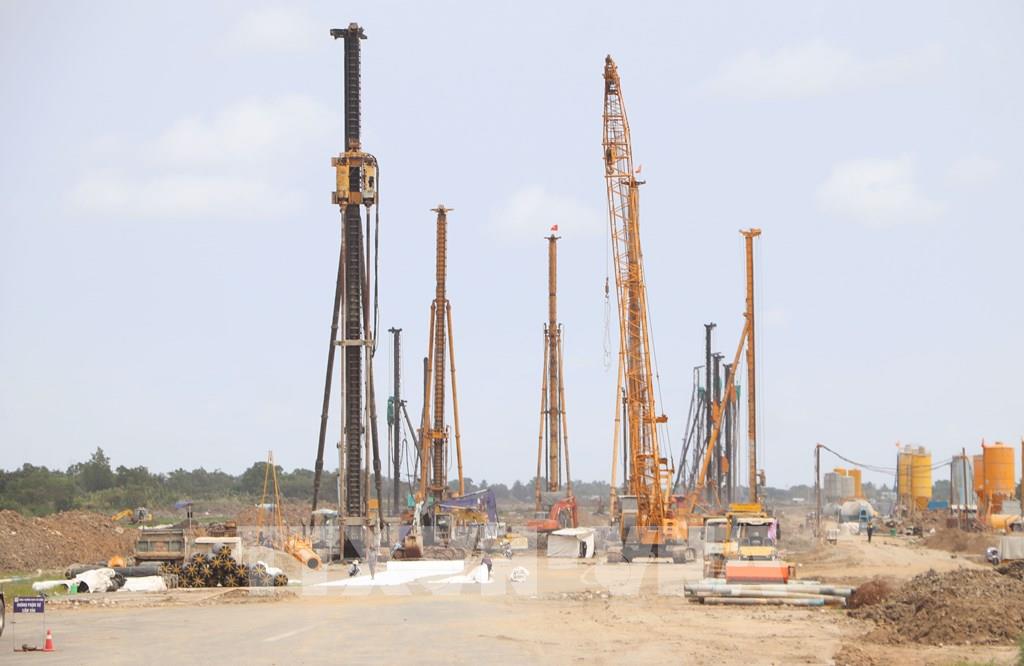 Công nhân tiến hành thi công ép cọc tại Dự án nâng cấp, mở rộng Cảng hàng không Cà Mau. Ảnh: Tuấn Phi - TTXVN