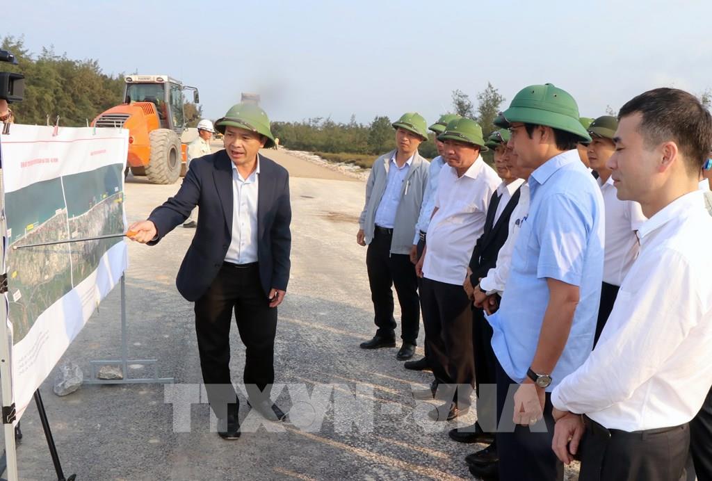 Chủ đầu tư báo cáo lãnh đạo tỉnh Quảng Trị tiến độ thi công Dự án đường ven biển tại Quảng Trị. Ảnh: Nguyên Linh – TTXVN