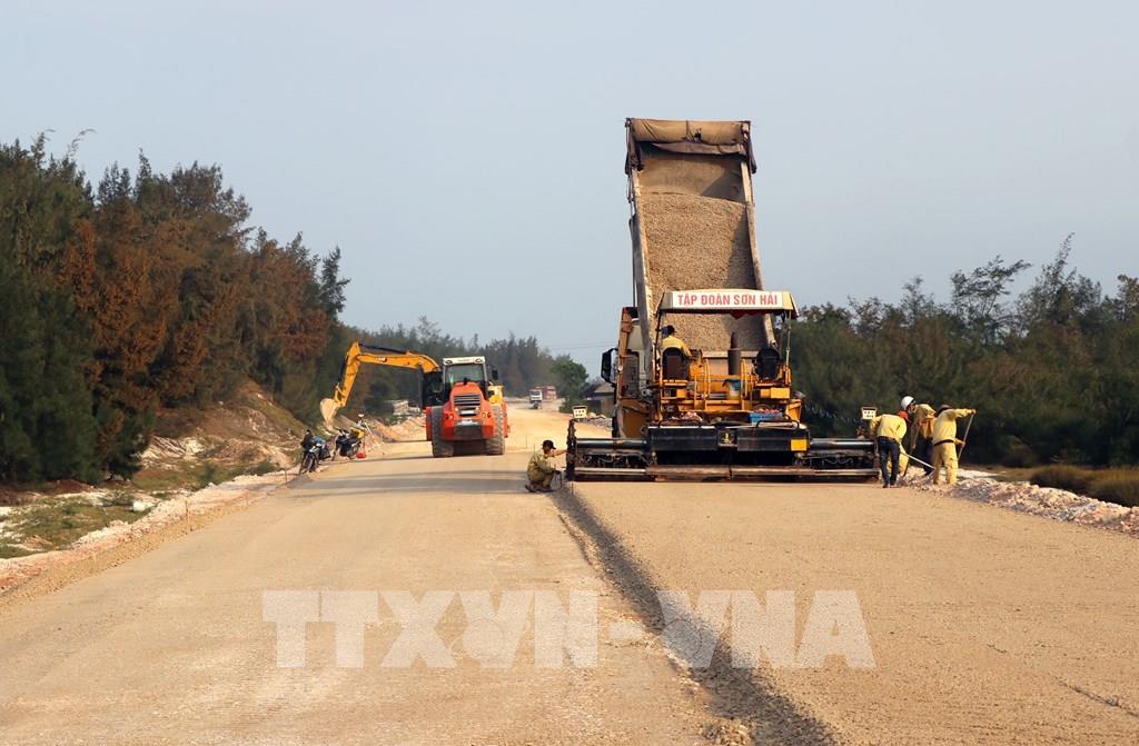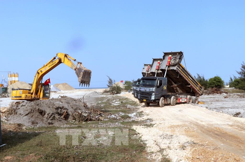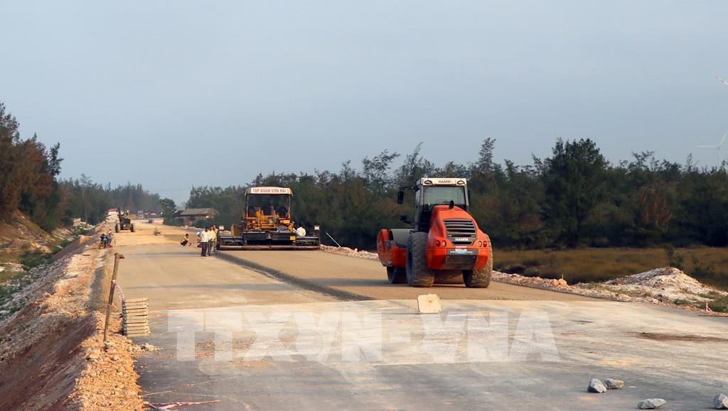 Ngay ngày làm việc đầu tiên sau kỳ nghỉ Tết, công trường đường ven biển tại Quảng Trị đã rộn ràng khí thế thi công. Ảnh: Nguyên Linh – TTXVN