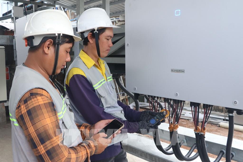 Nhân viên kỹ thuật Công ty Minh Phú kiểm tra nguồn điện của hệ thống điện mặt trời phục vụ sản xuất chế biến tôm. Ảnh: Tuấn Phi - TTXVN