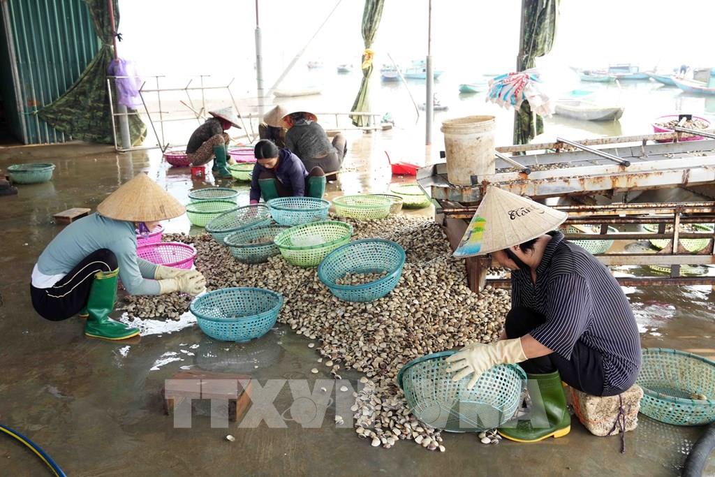 Người dân thôn Mai Lâm (xã Mai Phụ) sàng lọc, phân loại ngao bị chết. Ảnh: Hữu Quyết - TTXVN