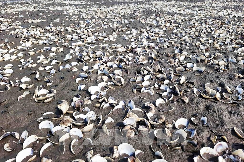 Xác ngao chết trắng bãi nuôi tại thôn Mai Lâm (xã Mai Phụ). Ảnh: Hữu Quyết - TTXVN