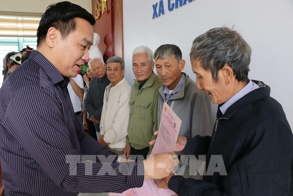 Chủ tịch UBND xã Chấn Hưng Nguyễn Anh Tuấn trao giấy chứng nhận quyền sử dụng đất lần đầu cho các hộ dân. Ảnh: Mạnh Minh - TTXVN