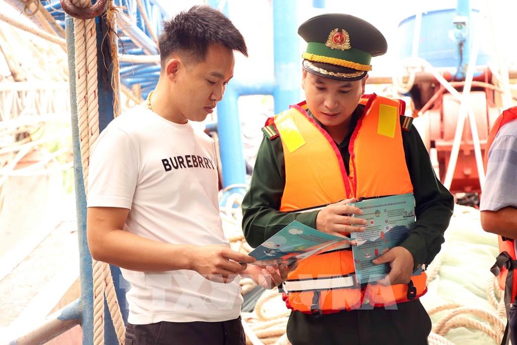 Lực lượng biên phòng tuyên truyền các quy định về khai thác thủy sản tại phường Nam Triệu. Ảnh: Hoàng Ngọc – TTXVN