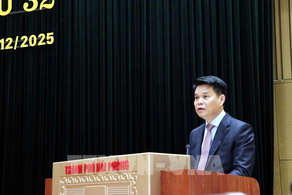 Chủ tịch UBND thành phố Hải Phòng Lê Ngọc Châu báo cáo tình hình phát triển kinh tế - xã hội năm 2025 và phương hướng năm 2026. Ảnh: Mạnh Tú - TTXVN