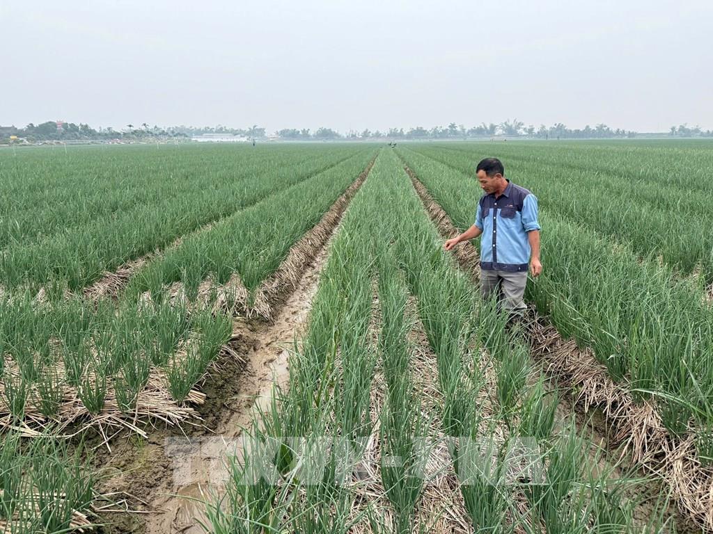 Anh Nguyễn Văn Diêm thôn Phương Quất, xã Nam An Phụ, Hải Phòng, kiểm tra ruộng hành của gia đình. Ảnh: Tiến Vĩnh –TTXVN