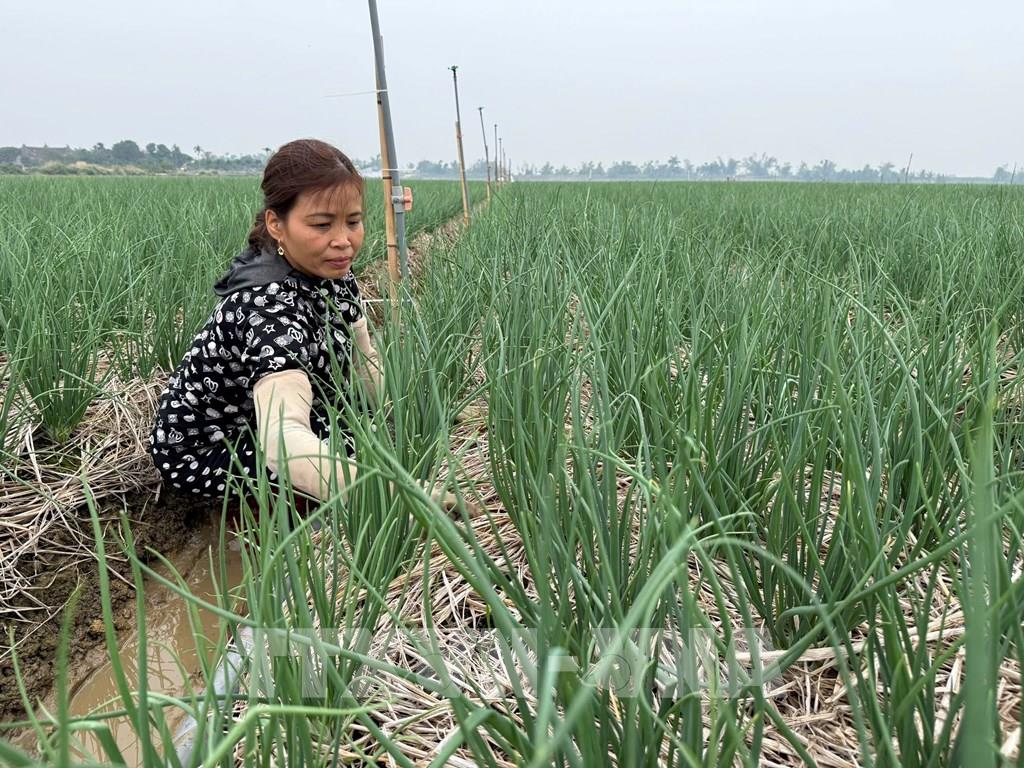 Chị Nguyễn Thị Thảo, thôn Phương Quất, xã Nam An Phụ, Hải Phòng, chăm sóc ruộng hành của gia đình. Ảnh: Tiến Vĩnh –TTXVN