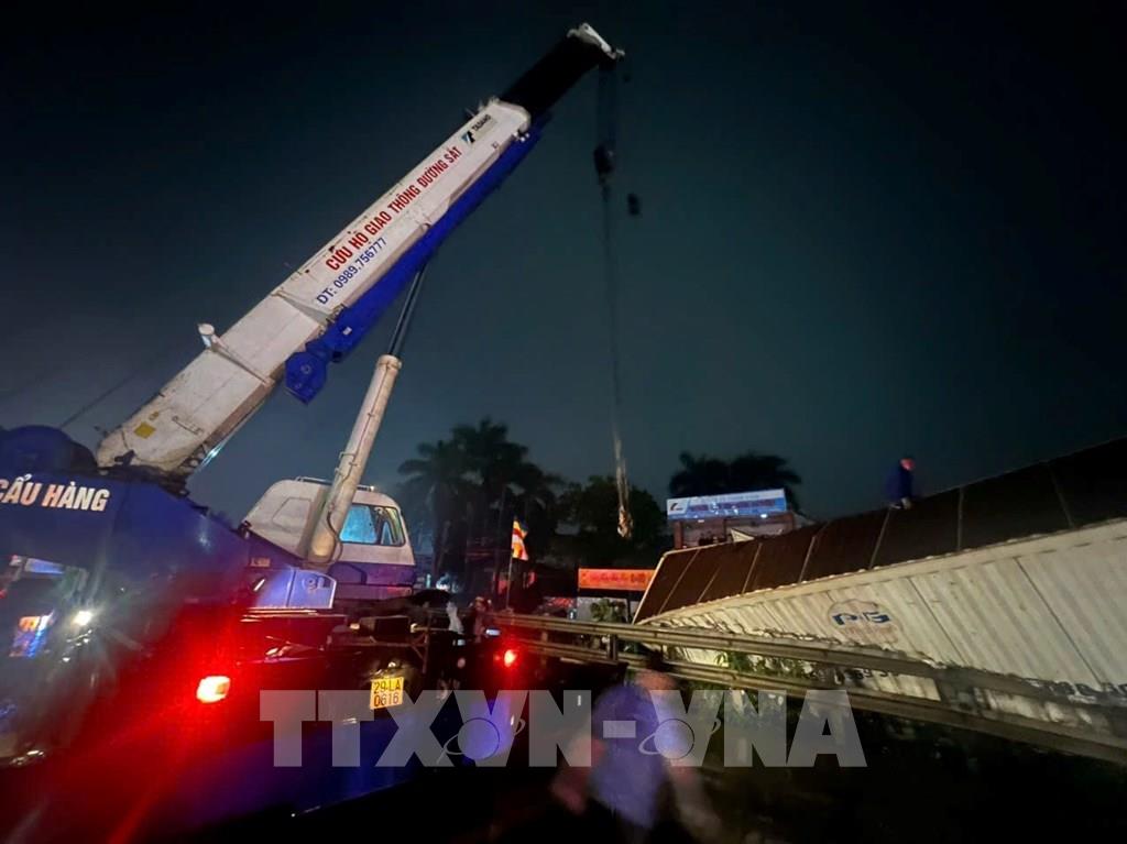 Lực lượng chức năng di chuyển ô tô tải bị nạn ra khỏi phạm vi đường sắt. Ảnh: Phạm Kiên - TTXVN
