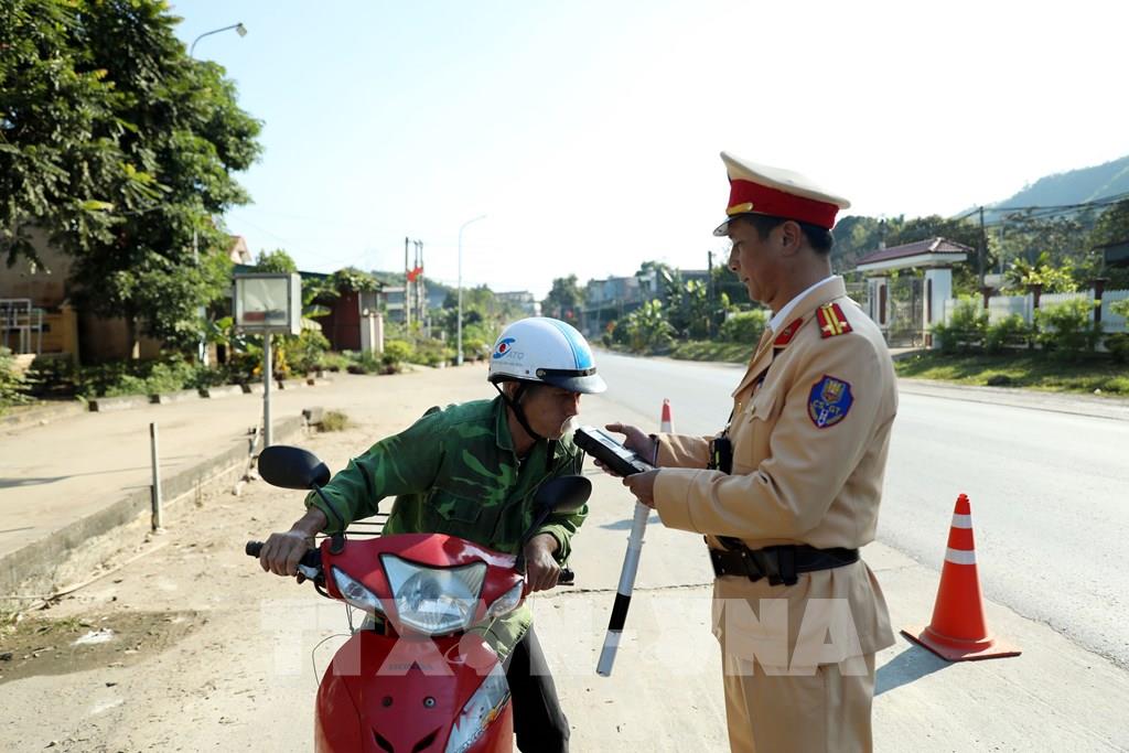 Kiểm tra nồng độ cồn của người tham gia giao thông tại Tuyên Quang. Ảnh: Quang Cường – TTXVN