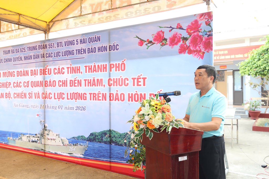 Thay mặt Đoàn công tác, ông Hoàng Văn Thắng - Trưởng khối Truyền thông và Thương hiệu Agribank gửi lời chúc Tết tới toàn thể cán bộ, chiến sĩ và bà con nhân dân đảo Hòn Đốc.
