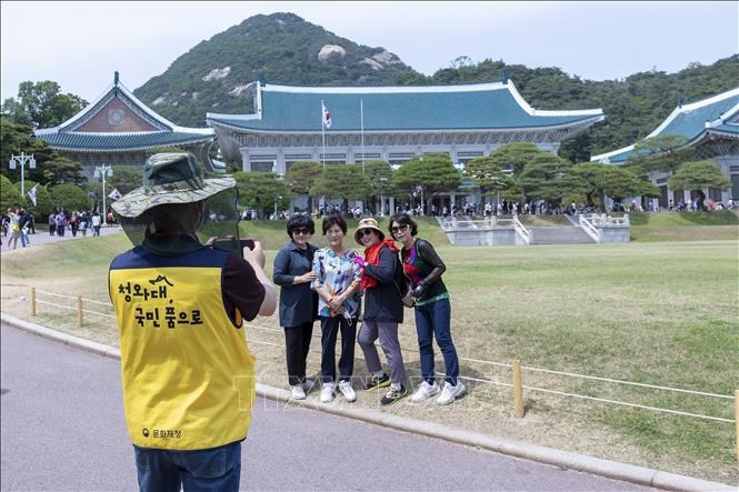 Khách thăm quan thích thú chụp ảnh trong khuôn viên Nhà Xanh, Hàn Quốc. Ảnh: Anh Nguyên-PV TTXVN tại Hàn Quốc