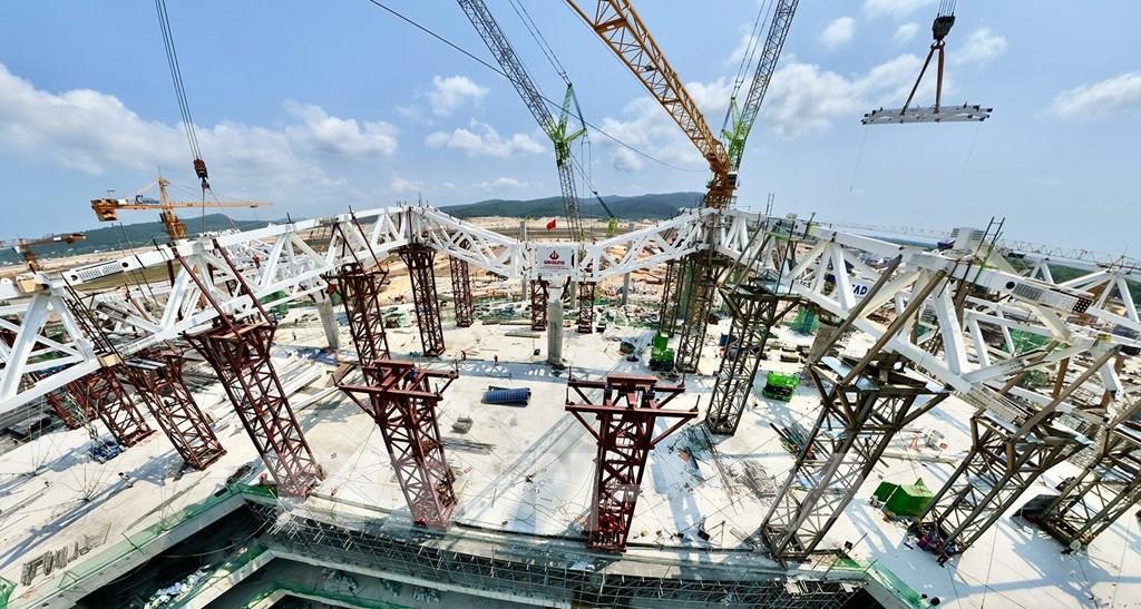 Tiếp đến, hạng mục công trình nhà ga hành khách T2 đã đạt 87% khối lượng kết cấu phần thô và đang bước vào giai đoạn lắp đặt hệ khung thép mái khổng lồ.Mặt khác, nhà ga VIP, nơi sẽ đón tiếp các nguyên thủ quốc gia tại Hội nghị APEC 2027, với 100% phần kết cấu thô và 70% kết cấu thép mái đã hoàn thành.