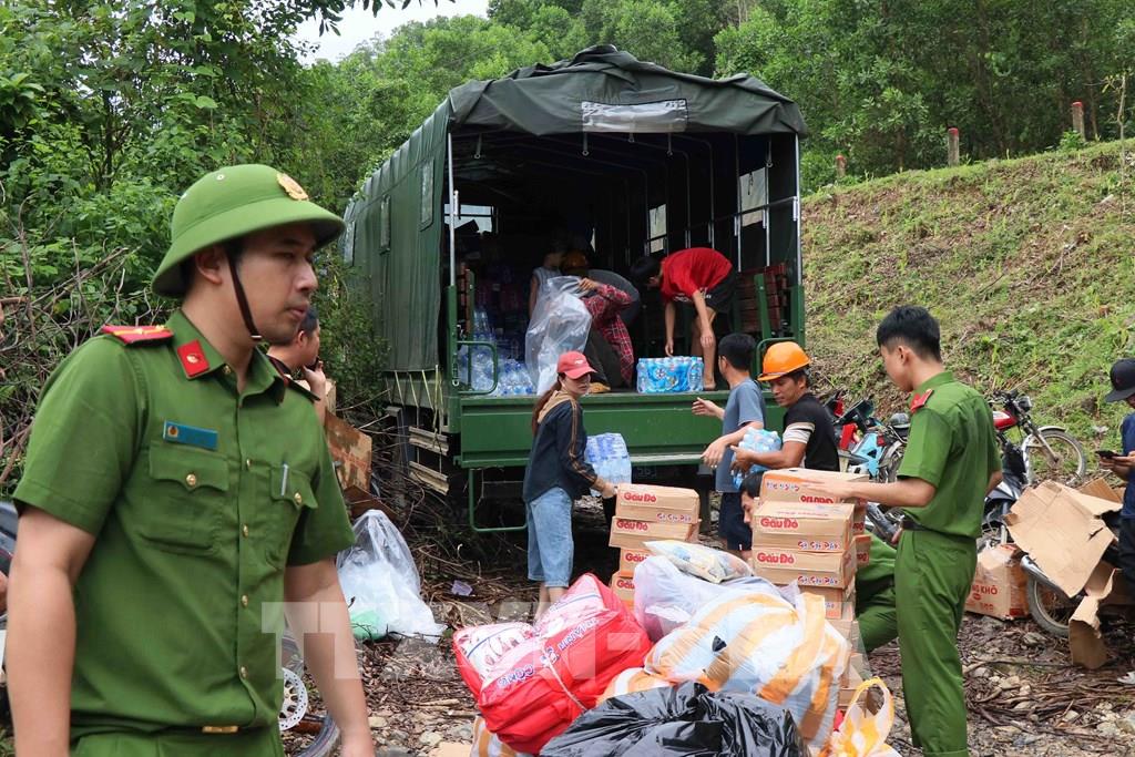 Lực lượng chỗ vận chuyển hàng chục tấn lương thực, thực phẩm, nước uống để cung ấp cho đồng bào. Ảnh: Đoàn Hữu Trung-TTXVN