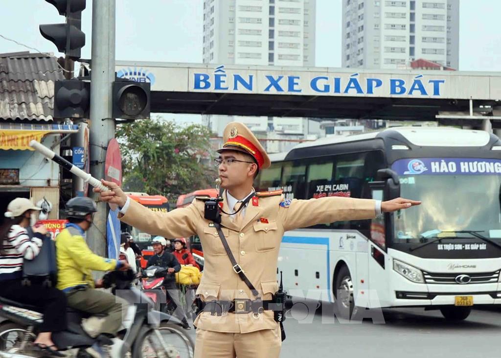 Lực lượng CSGT phân luồng, điều tiết giao thông tại khu vực trước khu vực Bến xe Giáp Bát. Ảnh: Phạm Kiên - TTXVN