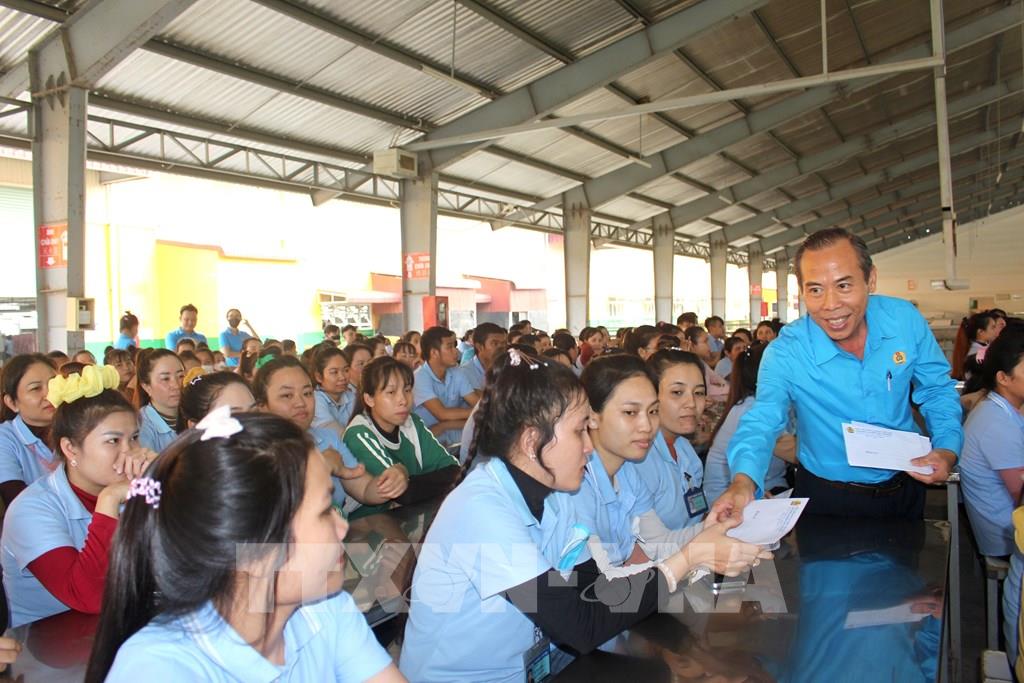 Liên đoàn Lao động tỉnh Lâm Đồng trao quà cho công nhân đang làm việc tại các đơn vị thuộc Công đoàn xã Hàm Liêm (tỉnh Lâm Đồng). Ảnh: Hồng Hiếu- TTXVN