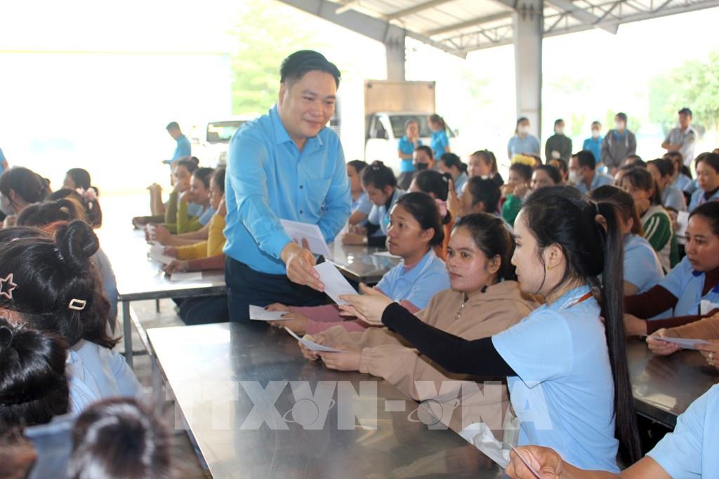 Chủ tịch Liên đoàn Lao động tỉnh Lâm Đồng Nguyễn Phú Hoàng thăm hỏi và trao quà cho các công nhân. Ảnh: Hồng Hiếu- TTXVN
