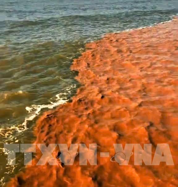 Nước biển 2 màu nước xanh và nâu đỏ kéo dài hàng chục km tại khu vực biển Tây, gần Hòn Đá Bạc, thuộc xã Đá Bạc, tỉnh Cà Mau. Ảnh: TTXVN phát