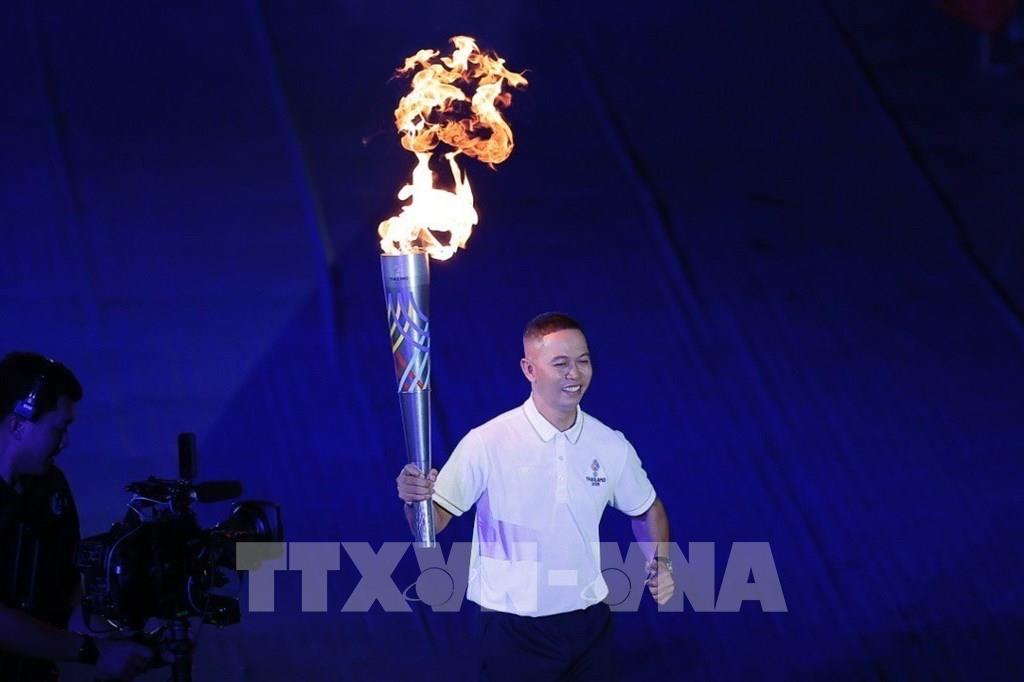 Các VĐV nổi tiếng của nước chủ nhà thực hiện nghi thức rước đuốc thắp sáng đài lửa SEA Games 33. Ảnh: Minh Quyết - PV TTXVN