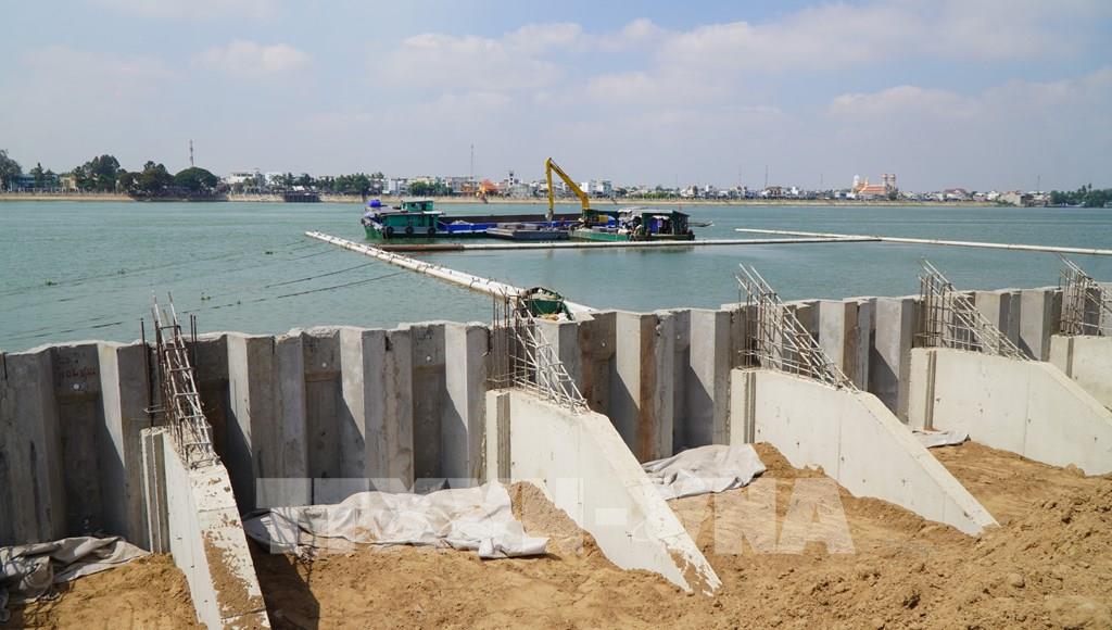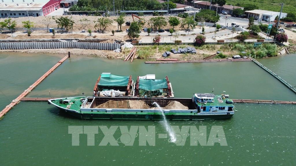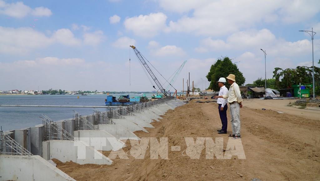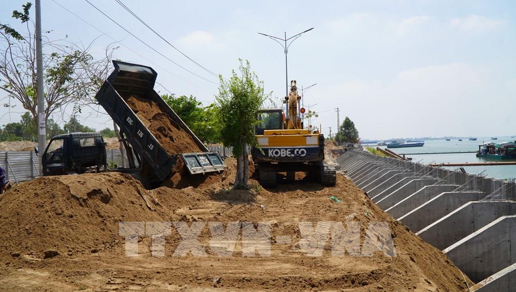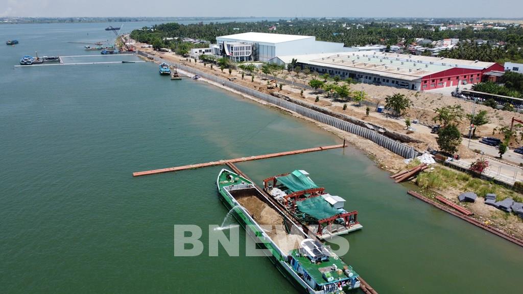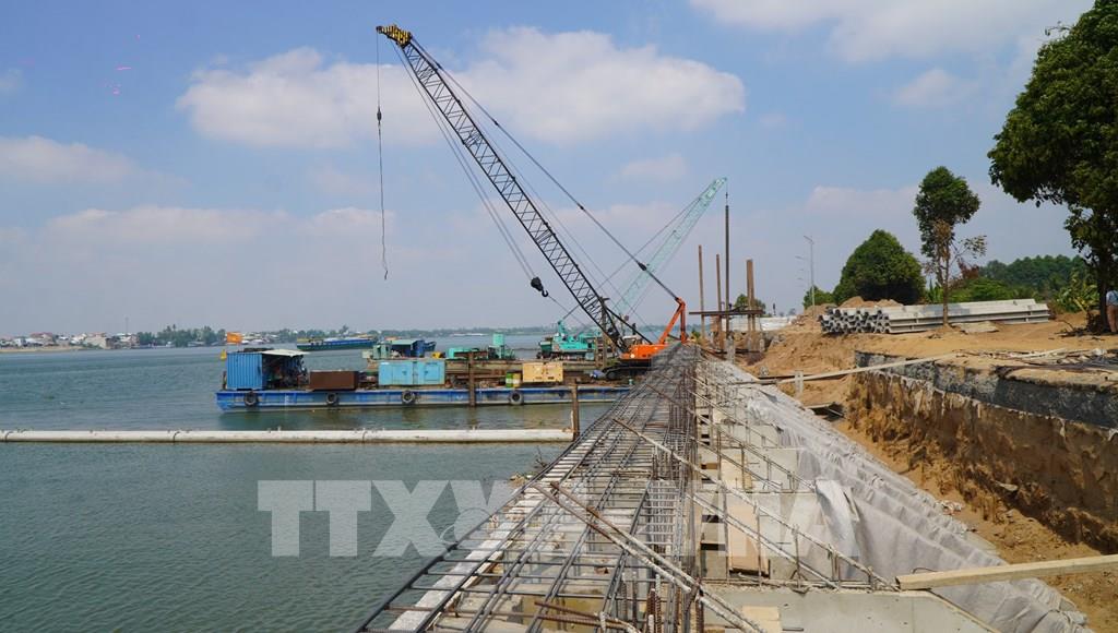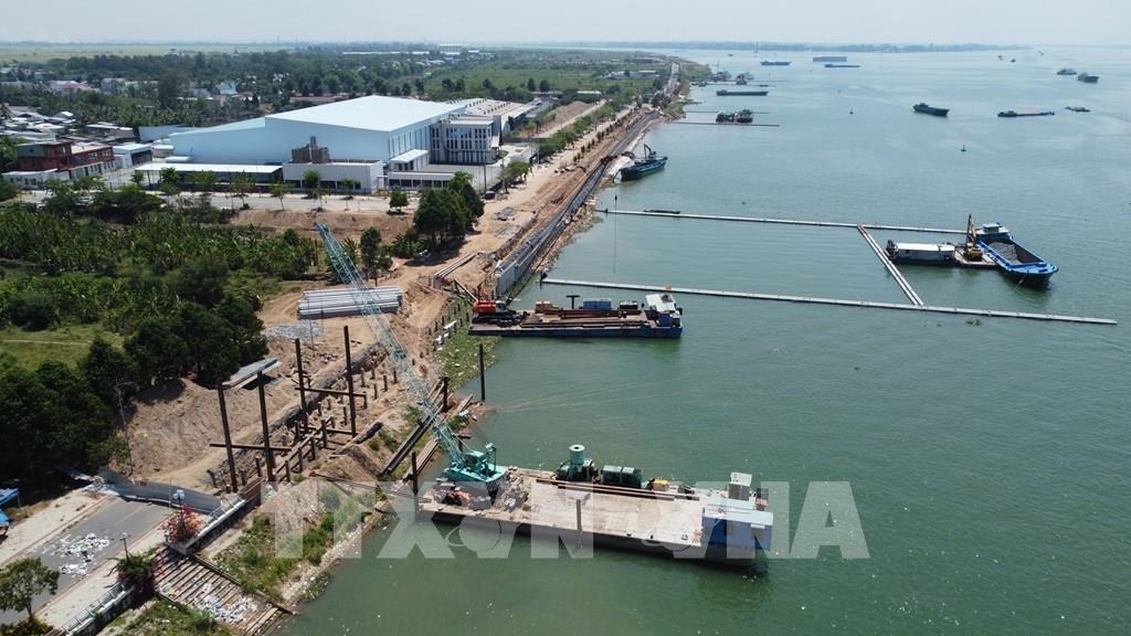 Công trường thi công Dự án khắc phục khẩn cấp sạt lở khu vực kè Thường Thới Tiền (xã Thường Phước, Đồng Tháp). Ảnh: Nhựt An - TTXVN