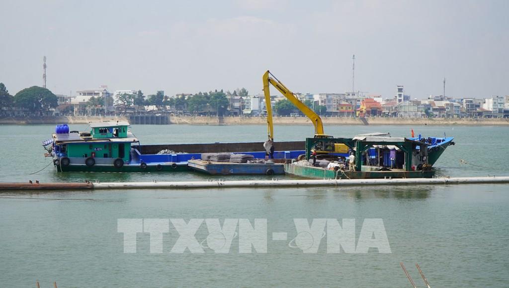 Tranh thủ điều kiện thời tiết thuận lợi đang là mùa khô, đơn vị thi công ưu tiên hạng mục thả thảm đá nhằm ổn định chân kè Thường Thới Tiền. Ảnh: Nhựt An - TTXVN