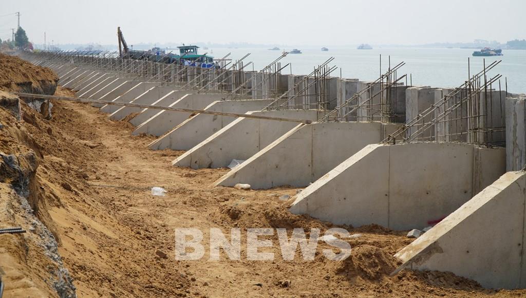 Công ty Cổ phần Xây dựng hạ tầng giao thông thủy lợi Hà Nội đẩy nhanh tiến độ thi công Dự án khắc phục khẩn cấp sạt lở khu vực kè Thường Thới Tiền. Ảnh: Nhựt An - TTXVN