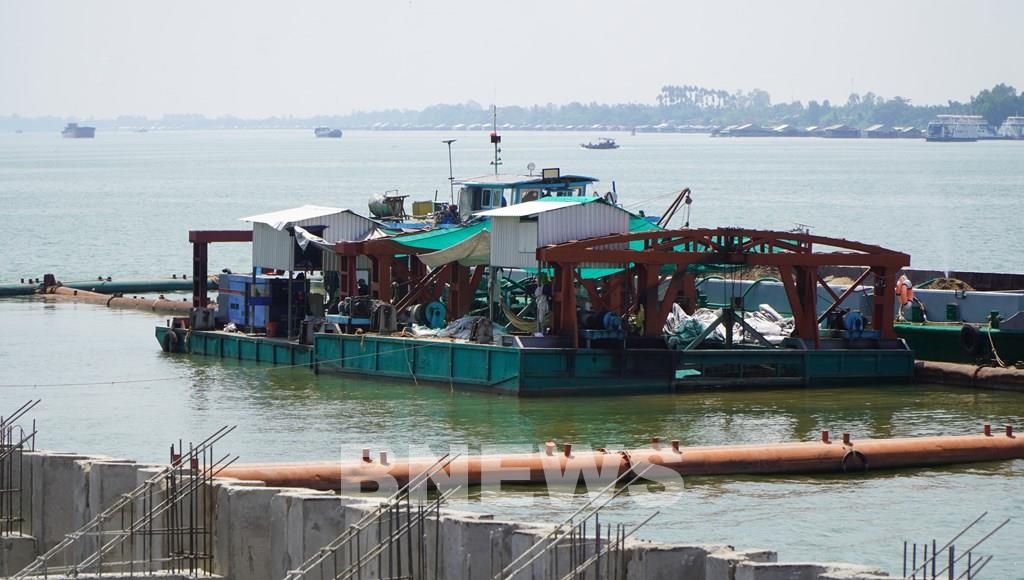 Máy móc, thiết bị thi công Dự án khắc phục khẩn cấp sạt lở khu vực kè Thường Thới Tiền. Ảnh: Nhựt An - TTXVN