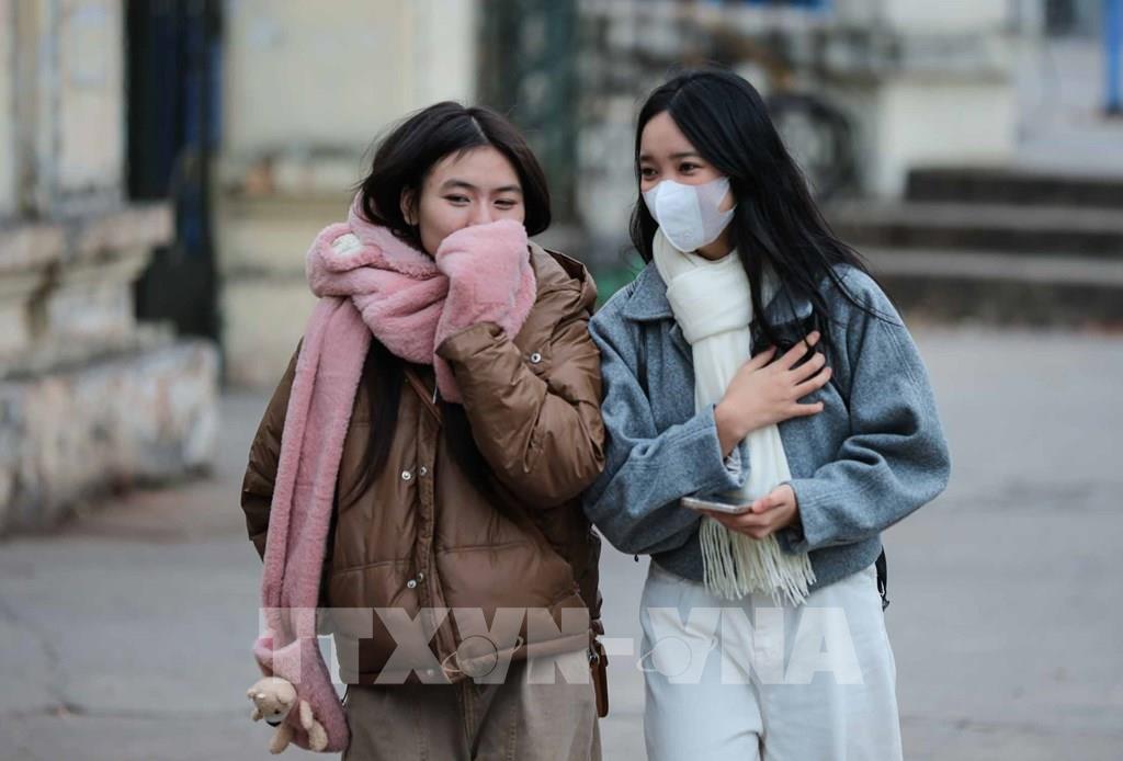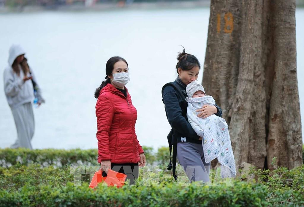 Người dân ra đường đều mặc áo ấm, khẩu trang, khăn quàng cổ để đảm bảo sức khoẻ khi phải ra ngoài trời. Ảnh: Hoàng Hiếu - TTXVN