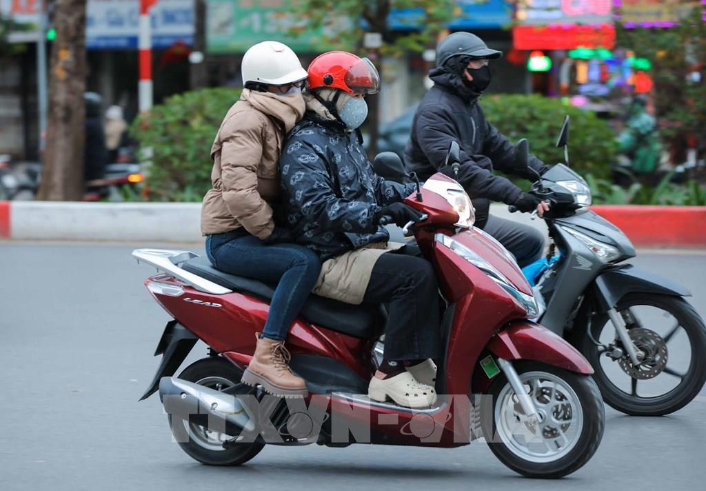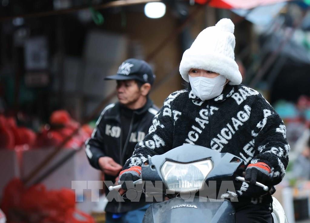 Người dân mặc áo ấm, khẩu trang, khăn quàng cổ, găng tay khi phải di chuyển ngoài trời. Ảnh: Hoàng Hiếu - TTXVN