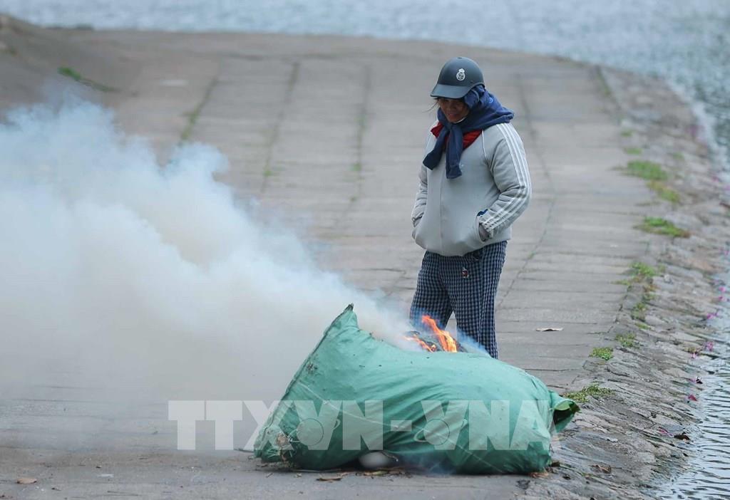 Một người dân đốt lửa tại khu vực hồ Thuyền Quang chiều 22/1. Ảnh: Hoàng Hiếu - TTXVN